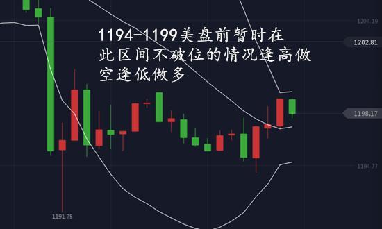 1194-1199美盘前暂时在此区间不破位的情况逢高做空逢低做多,目前的盘走势是偏多。所以不建议大家现在去操作空单,有多单在手的看上方1199阻力,有空单在手的朋友也是一样,1199、1200如果仅仅只是虚破没有站稳那么你们套的单子还有救,要不然得提早出掉。没有操作空仓的你们就观望这些个点位来操作。晚上九点“空头司令”德拉基讲话他是一个大利空的人物,大家关注好。
