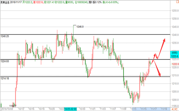 总结:一旦美联储加息次数或步伐不及预期,美元将大受打击。目前美元已经见顶,随着信贷利差走阔、股市下跌,且主权债券收益率在通胀减速、油价缩水之际开始下行,美元将走软,而本周还有一件大事件,就是脱欧的进展,在周三的英国内阁通过脱欧草案,黄金大涨近15美金,周四周五两天在内阁通过草案后,英国的脱欧大臣相继辞职,但我们可以看到黄金并未受到太大的影响,其最主要的原因在于,美联储官员的相继发出鸽派言论,给到黄金多头支撑,所以在周五黄金再次大涨13美金,而美联储的鸽派言论将给到黄金多头长期的支撑,后续我们还需要继续去关注这一方面的消息。