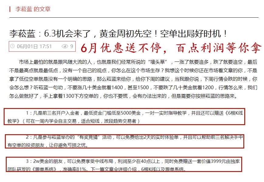 本文标题:李菘蓝:为何6根K线和跟单系统能够让黄金投资者获利!原因在这!,收录于资讯网:分析师观点栏目,由作者注册账号自主在后台发布,本站仅作为展示平台。文章包含的任何信息都与本站无关,请读者理性甄别信息是否有效,若内容中存在任何侵权、不实和违规信息,可通过邮箱与我们取得联系及时清理!