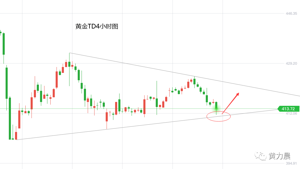 黄金TD:周三黄金TD开盘价424元,盘中小幅走高刷新一周高位至424.8元,随后金价至高位回落,跌势延续到周四日内,刷新一周低点411.5元,但并未跌破下方的上行趋势线,目前暂时在接近趋势线位置获得支撑,说明黄金TD目前的反弹上行趋势还未遭到破坏,金价企稳后存在继续反弹的可能,上方金价反弹高点逐次下移,暗示上方压力增强,整体看黄金TD短期内再次整理的可能性偏大。