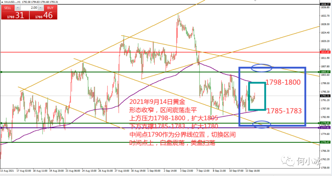 上方反复测试1800关口区域,下方反复测试1783区域范围,四小时收窄区间1785-1800,同样处于这个区域范围。
