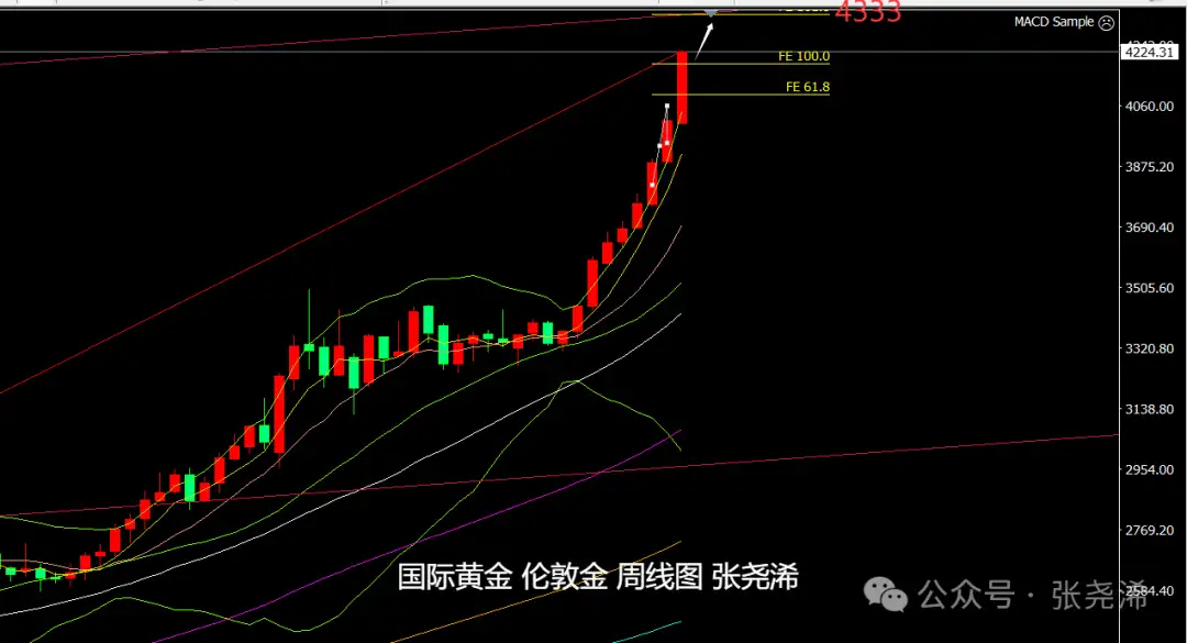 周图,金价自去年开涨攀升以来,如期第4次回踩中轨线支撑,并再度展开持续向上攀升的多头行情,不断到达给出的看涨目标位,目前虽继续运行在布林带上轨之外,但多头动力持稳,未有明显减弱迹象,加上目前走势初步突破4200关口阻力,因而,本周来看,依然还是偏看涨为主。有望进一步冲击下一个扩展线目标4333美元附近。