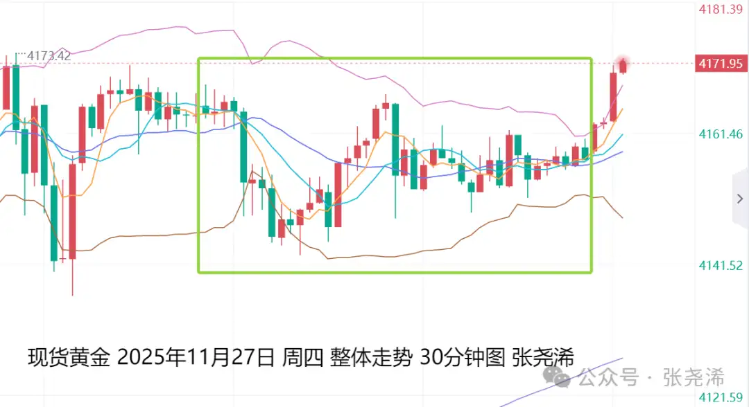 展望今日周五(11月28日):国际黄金开盘延续昨日回升之力先行反弹走强,美元指数早盘表现走弱,也对其产生一定支撑,并且,昨日 普京表示和平协议目前尚无最终版本,美军B-52H轰炸机在加勒比海进行攻击演习等,也增强了一定的地缘局势避险需求。整体来看,金价短期将维持反弹趋势不变。操作依然偏向低多为主。