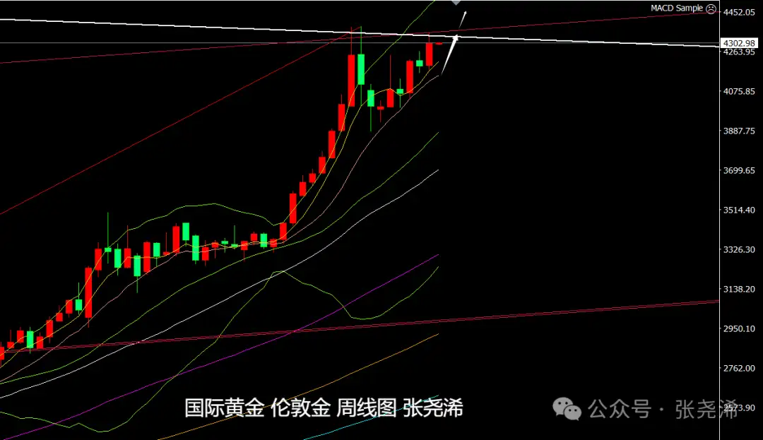 具体走势上,金价自周初开于4196.40美元/盎司,先行筑底震荡,于周二录得当周低点4170.19美元后,连续震荡回升,周四多头动力加大突破之前震荡阻力,周五进一步攀升录得当周高点4353.49美元,但尾盘明显回撤跳水,最终收于4301.15美元,周振幅183.3美元,收涨104.75美元,涨幅2.5%。