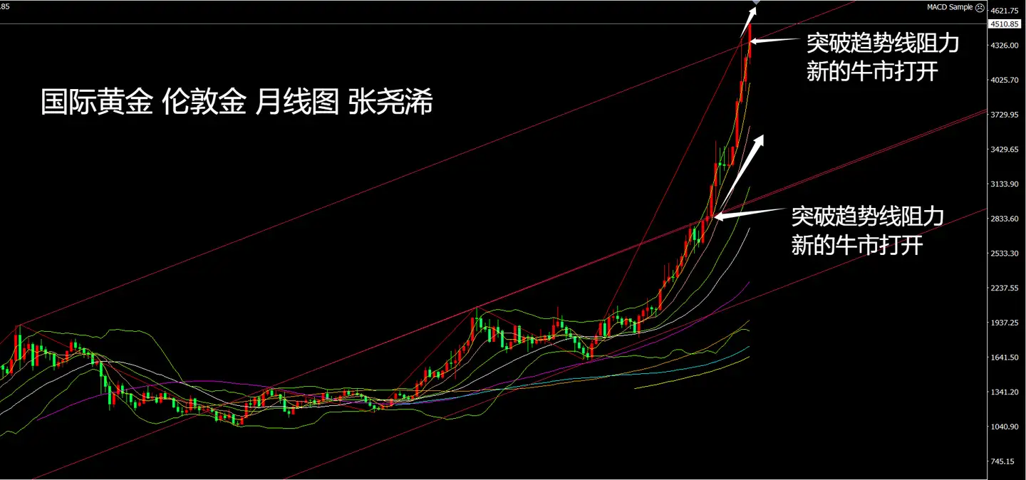 其2025年的利好因素,关税担忧,降息预期,地缘局势等等仍然存在,并有进一步扩大的预期;所以,未来一年周期,全球经济仍面临结构性挑战,主要央行货币政策整体偏宽松,地缘局势长期处于不稳定等等因素的支撑而仍可觊觎触及5000美元关口或更高位置。