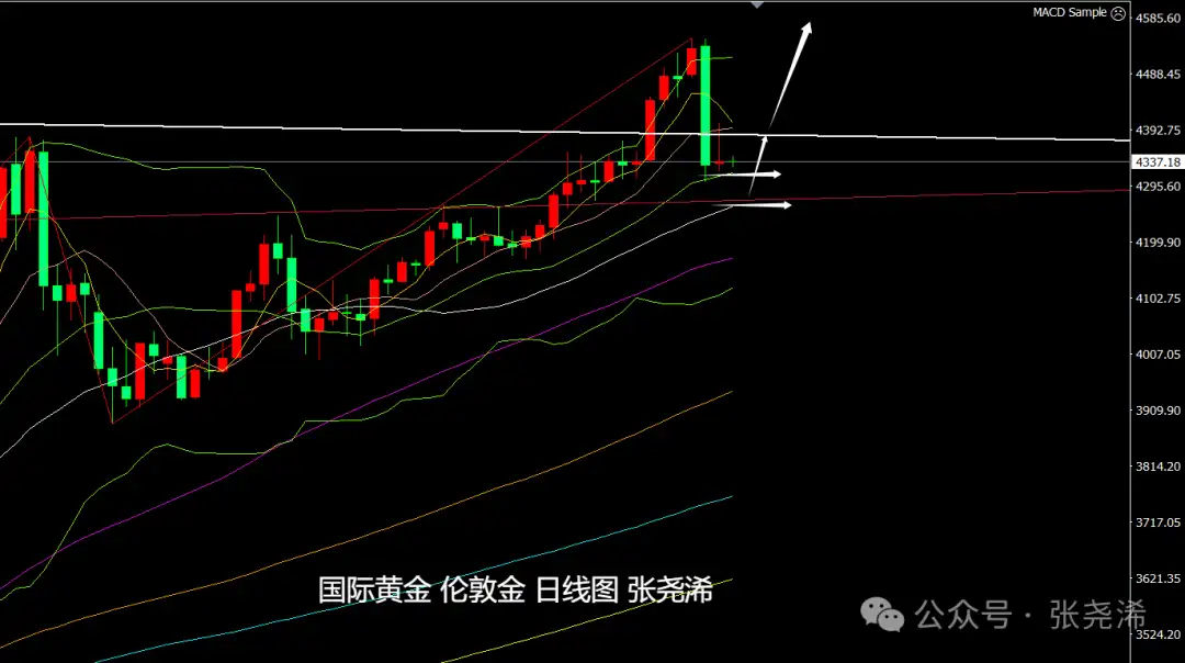 日图;金价昨日虽反弹遇阻,但也收取止跌看涨形态,中轨支撑仍未跌破,故此,在跌破此支撑前,仍可先行看涨,如进一步走低,下方30日均线4260美元或60日均线4175美元都是再度入场看涨的位置。