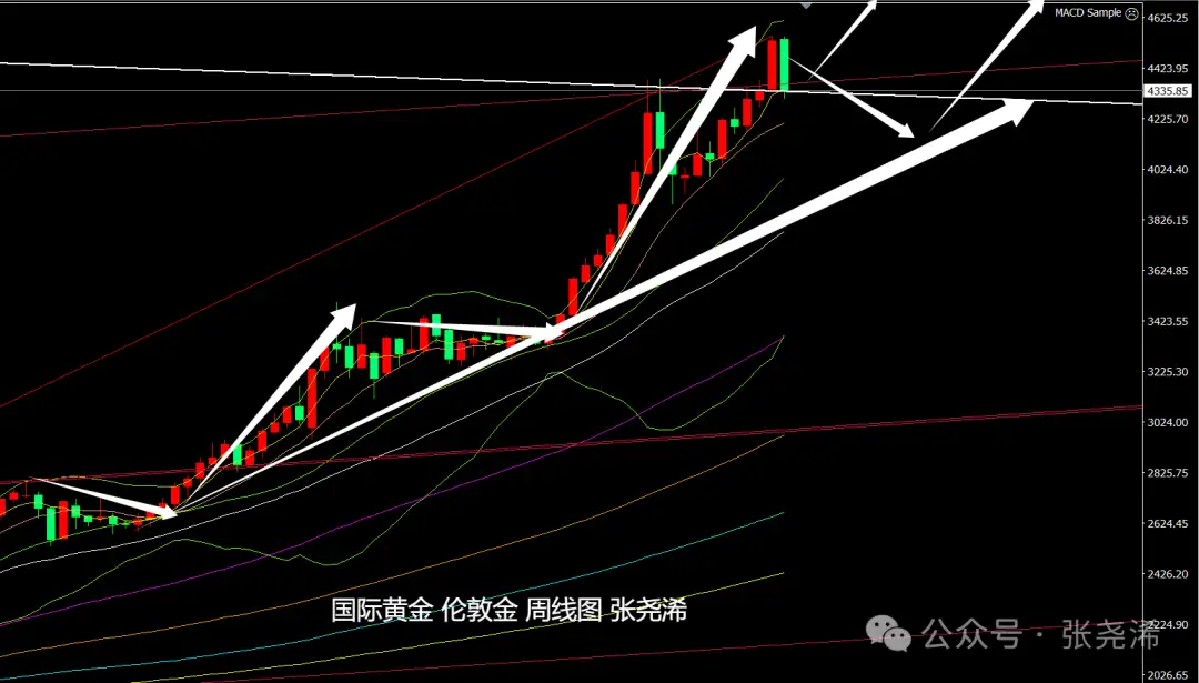 周线级别,金价本周遇阻回落转跌,相对于前周有形成阴包阳看空回落的预期,暗示后市将有继续走低触及10周均线4230美元乃至中轨及30周均线支撑位置4000美元关口附近或下方的预期,但如后市持稳于4300美元上方,则多头仍具看涨攀升动力,可继续布局多单入场。