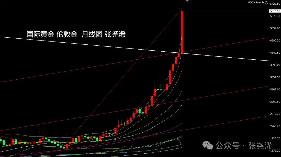 技术上,月线级别,金价本月再度强势拉升,突破趋势线阻力,并走出超远距离的多头行情,当下在月底也如期触及5500美元上方,虽然存在超买和调整需求,但预计也仍将会处于突破后的趋势线阻力上方,也暗示进一步打开的新牛市空间有效,后市也将继续保持看涨,等待不断的新高出现。