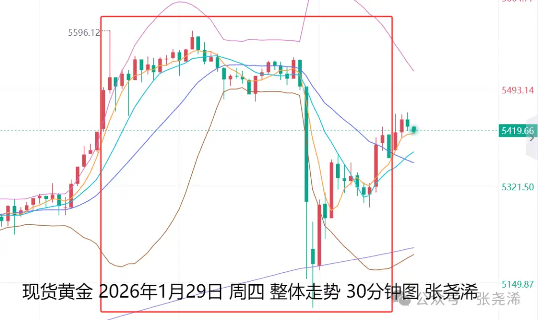 上交易日周四(1月29日):国际黄金黄金创下史上最大单日振幅(近500美金),先是一度最高冲到接近5600美元,之后又一度跌至5100美元附近;最终又触底回升,振幅缩减,小幅收跌。走势上,仍维持在上升趋势内,多头仍具前景。