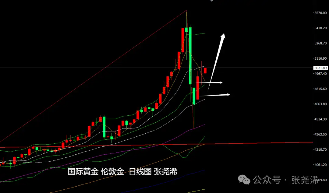 上交易日周三(2月4日):国际黄金高开后,最终震荡十字收平,但仍处于中轨上方,后市仍具走强前景,如收线在5100美元上方,多头动力则稳健加强,可跟进看涨新高。