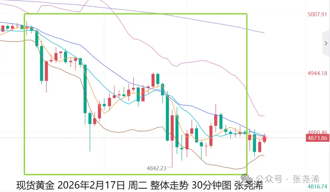 上交易日周二(2月17日):国际黄金遇阻回落再度收跌,因伊美和谈释放积极信号,特朗普宣布美日贸易协议正式启动,减弱了避险需求,令其处于短期均线及中轨下方,空头暂占据优势,但又由于美联储古尔斯比:如果通胀走低,将会有多次降息的鸽派言论,基本面前景仍维持看涨,所以,那么,在重回中轨上方持稳后顺势跟进新高,要么维持目前偏弱调整待回踩60日均线或10周均线支撑后,再去看涨反弹。