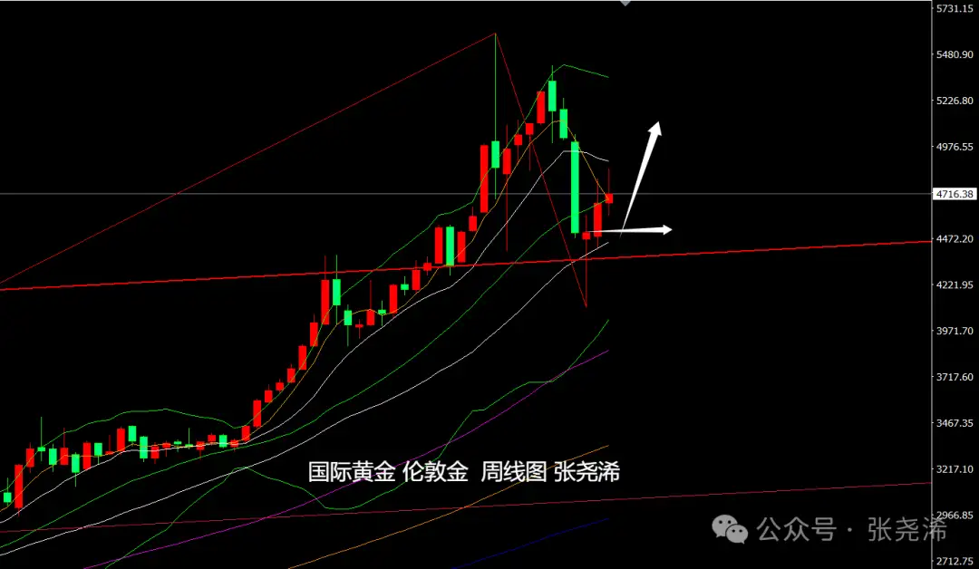周图级别,金价本周目前延续前周的触底回升看涨形态再度走强,目前运行在中轨之上,但未能突破10周均线阻力4900美元上方,如本周收取倒垂形态,则下周偏向回踩4500美元关口或其下方后再度反弹。反之则将继续走强上行。