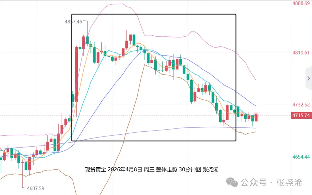上交易日周三(4月8日):国际黄金冲高回落收取长上影线倒垂看空形态,虽然早盘因美伊同意停火2周,打压油价及美元大幅走低,推动金价拉升走强,但停火局面脆弱,伊朗和以色列恢复敌对行动,伊媒也表示霍尔木兹海峡已全面关闭,若以对黎袭击不停,伊朗将退出停火。美联储会议纪要也表示更多官员提及加息可能性,美伊局势再生变数,利率预期也有所转向,这打压金价回吐日内涨幅,并收线。