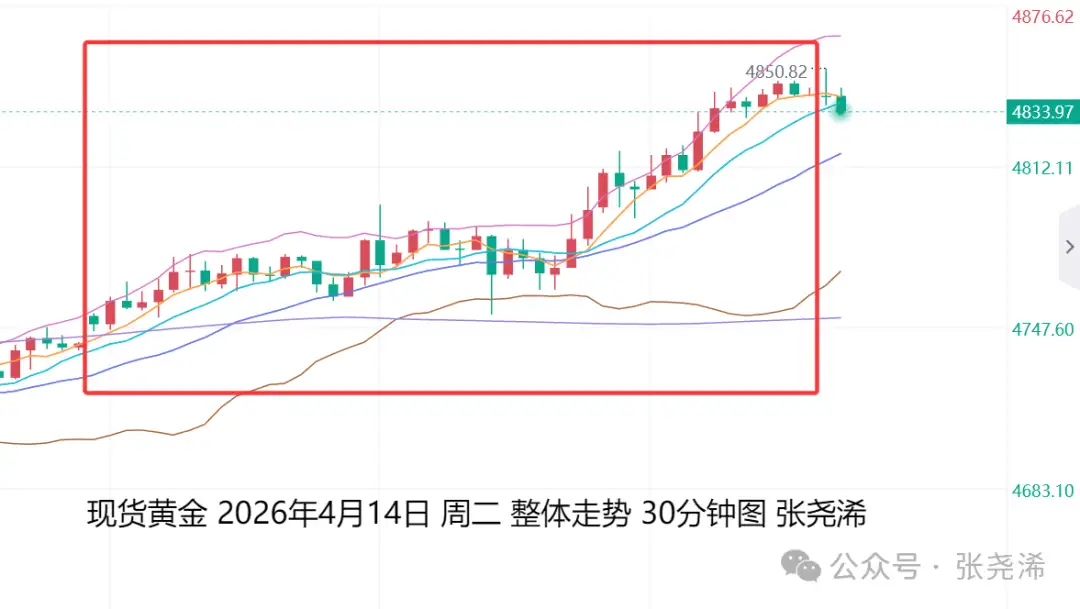 上交易周二(4月14日):国际黄金/伦敦金延续周一触底回升之力,以及美元指数跌至六周低点,同时市场对美伊谈判重启的乐观预期显著升温,原油价格也继续回落,共同缓解了因中东冲突引发的避险与通胀双重压力的利好提振,而反弹走强收涨,并突破30日均线阻力,短期多头动力偏强,但目前临近30周及60日均线压力位置,短期留意遇阻回调风险,如突破60日均线阻力,则有望进一步看涨至5100关口附近。