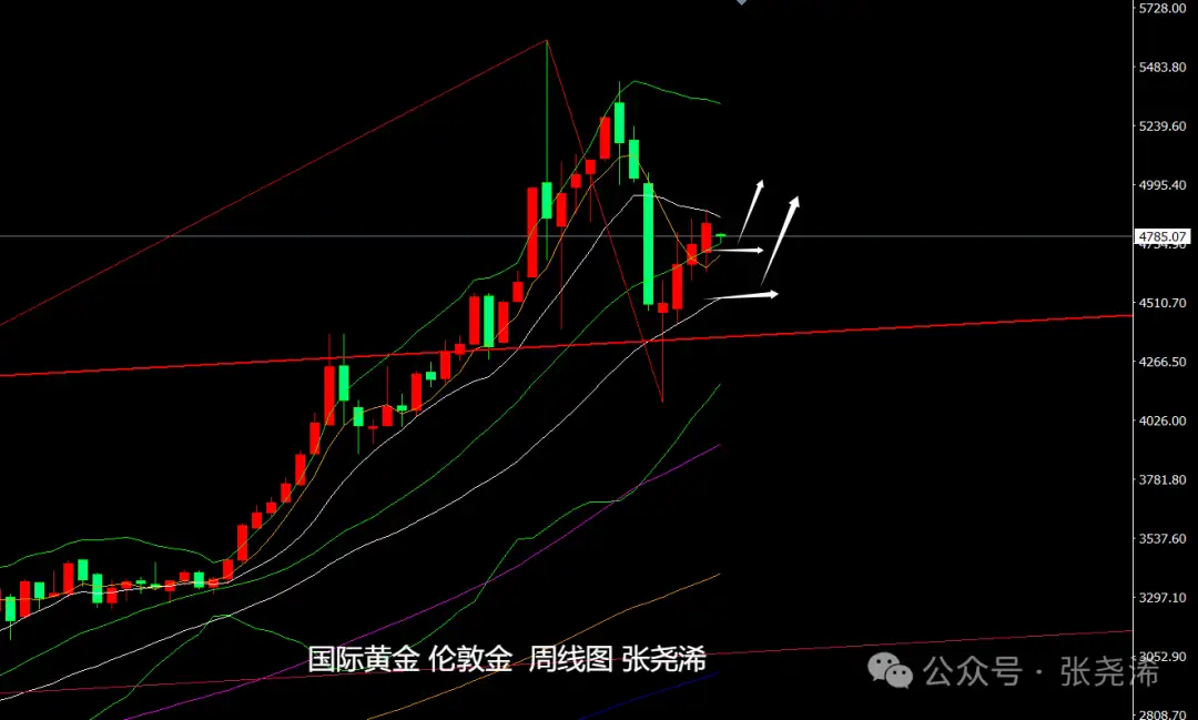 周图级别,金价上周继续反弹收涨,但仍未突破10周均线阻力,令后市仍具有调整回撤至4450美元附近的风险,如突破10周均线阻力收阳,则有望再度刷新历史高点。而本周下方也有中轨和5周均线支撑,故此,目前回撤触及中轨或5周均线,则仍先看涨入场为主。