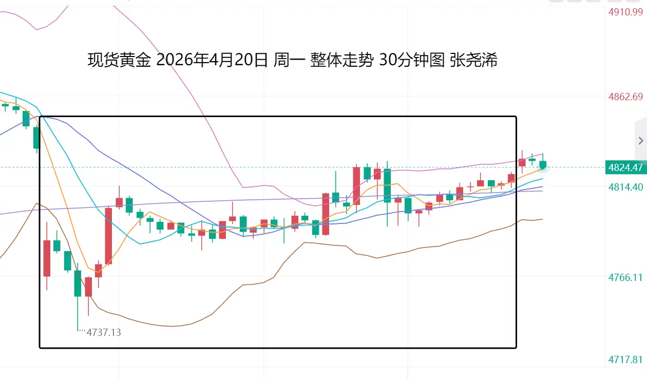 具体走势上,金价自亚市低开于4791.67美元/盎司,并先行走低录得日内低点4736.64美元,之后触底回升,并日内陷入震荡偏回升的倾向走盘,延续到美盘时段录得日内高点4827.22美元,但仍未收复缺口,最终收于4820.37美元,相对于上周五收盘价4835.08美元,日振幅98.44美元,收跌14.71美元,跌幅0.3%。