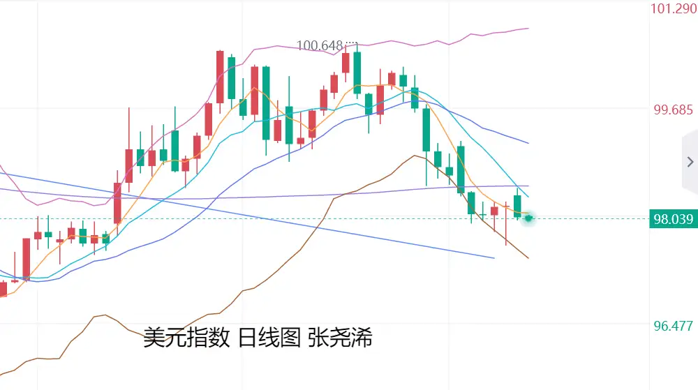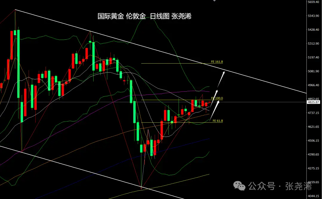 周图级别,金价上周继续反弹收涨,但仍未突破10周均线阻力,令后市仍具有调整回撤至4450美元附近的风险,不过现在也未跌破中轨和5周均线支撑,并再度偏强反弹,因而个人来看,突破10周均线的概率比向下跌破的概率较大,故此,操作还是以看涨为主,等待突破阻力进一步转强。