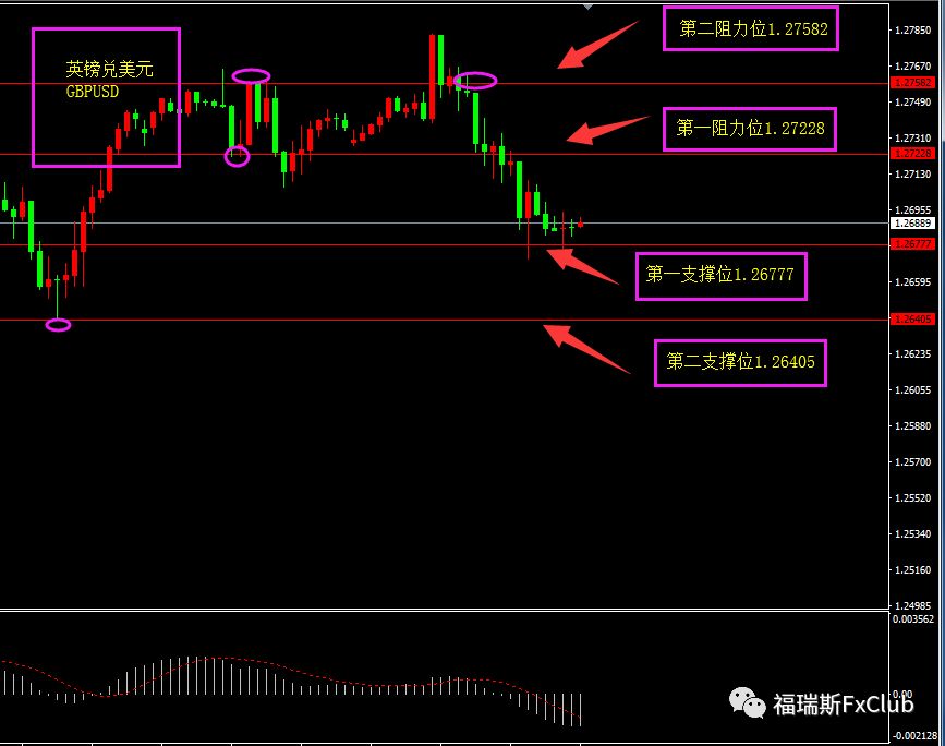 天图美日空头为主,避险属性导致日元一波三折,短期更多在底部震荡。小时图虽有下跌,但亦有大阳线拉升,MACD上移接近0轴,多头逐渐占据上风?
