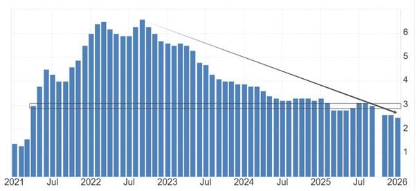 美国2月未季调核心CPI年的预期值为2.5%,与前值持平。历史数据看,2.5%的核心通胀率,是2021年4月份以来的最低水平。2022年9月份以未美国的核心通胀率一直处于下降趋势。按照目前的下降速度估算,美国的核心CPI数据将很快跌破2%的温和通胀标准。