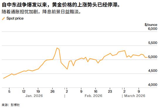 持续不断的美国-以色列与伊朗冲突削弱了黄金此前的涨势,过去两周金价波动剧烈,投资者抛售黄金以弥补其他投资组合的追加保证金。尽管如此,金价今年迄今仍上涨了约18%,并基本维持在每盎司5000美元的关口上方。