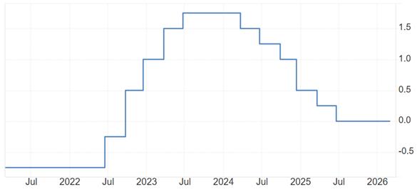 2024年3月份至今,瑞士央行持续降息,基准利率从1.75%降至目前的0%,也就是零利率.零利率状态已经持续了将近10个月,但瑞士的核心通胀率并没有反弹迹象。如果今年下半年瑞士进入通货紧缩状态,不排除瑞士央行会选择极端的负利率政策。